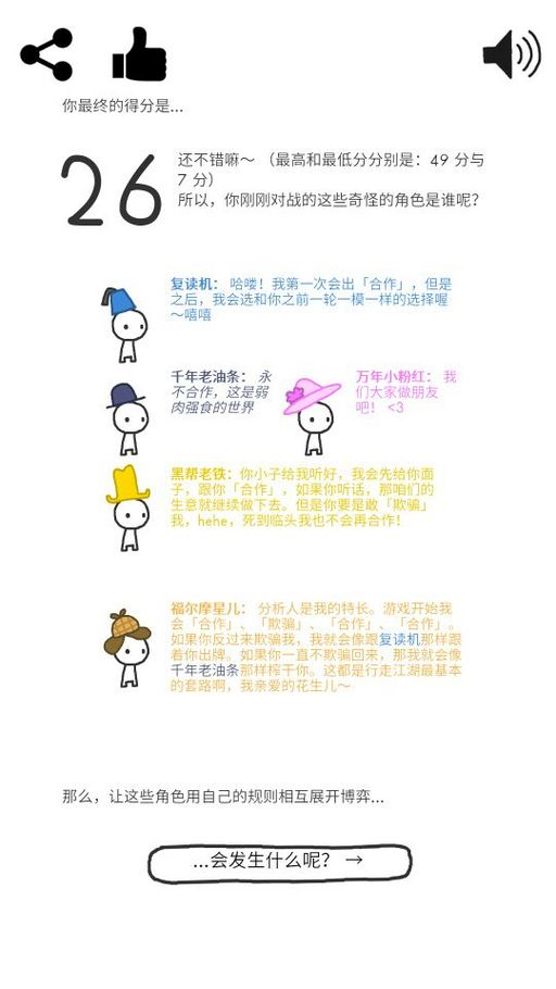 从这个游戏来看,复读机就像是我们社会上的大部分人,就如同上街买了点东西,东西不好吃了点小亏也不找回来了,反正也不去你那了。小红这样的就是你好我好大家好,福尔摩斯就有点冒险,我一直选择欺骗,他有时候还和我合作,有那么点赌徒心理。