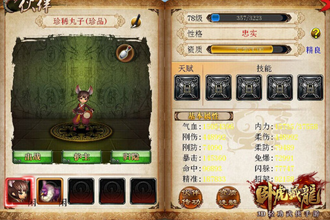 在《卧虎藏龙》中,小伙伴拥有自己的独立等级和特色养成系统,玩家可以通过多种途径提高它们的综合实力和技能方向。其中传功是伙伴升级唯一途径,也是最基础的养成操作。每一位伙伴天生自带基础经验,而将若干伙伴的经验合成传给重点培养的伙伴即为传功,在此过程中传功伙伴的资质越高升级效果越明显。
