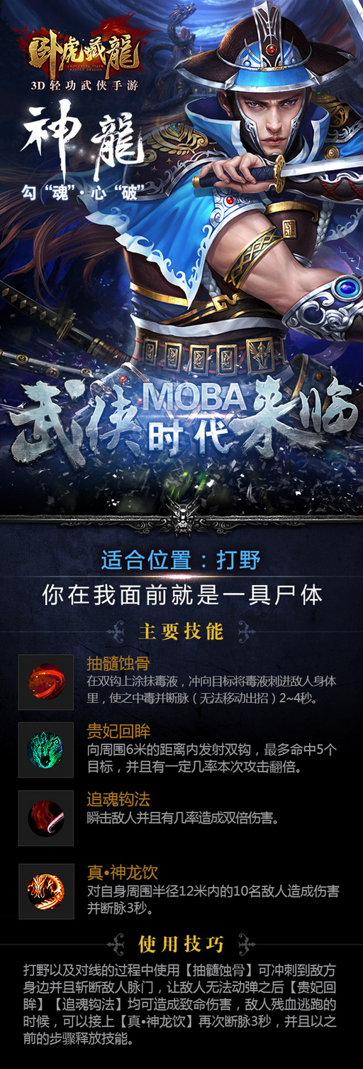 与坦克不同,打野需要技能更灵活、控制力更强的职业,而神龙完全可以胜利这一要求。神龙的招式十分狠辣,经常可以造成“断脉”效果,使敌人陷入完全被动的状态。比如抽髓蚀骨与真神龙饮这两个招式不仅伤害很高,还能让敌人感受到断脉无力的痛苦。而贵妃回眸与追魂钩法则在暴击与瞬发效果上发挥出色,是追击敌人的必备杀招。神龙最受欢迎的还是群攻技能,同时重创5-10人的超强战力令人刮目相看,也是清场补刀的最佳选择。