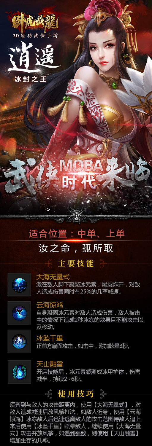 逍遥身为《卧虎藏龙》中法术最精深的职业,无论上单还是中单都可以完美出战。他不仅拥有强大的减速技能,并且在救援、逃生能力上也技高一筹。在战场上,逍遥可以灵活游走于地图之间,使用大海无量式、冰坠千里、云海惊鸿等招式为敌人减速,掩护队友撤退调息,还可以使用天山融雪增加自己的生存几率,成为场上的存活王。