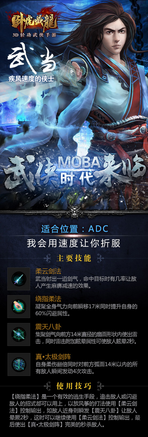 以气御剑是武当的职业特色,他们身形飘逸,擅长远程攻击,在战术上处于进可攻退可守的灵活状态,非常适合放风筝的ADC位置。柔云剑法不仅可以凭剑气对敌人造成伤害,还能够产生麻痹减速的效果,绕指柔法则可以提升闪避属性并瞬间移动,确保玩家在战场上的机动性。即使不慎被近身,也可以瞬发震天八卦眩晕敌人后逃脱,或是以真太极剑阵发动强力群攻一次秒杀。