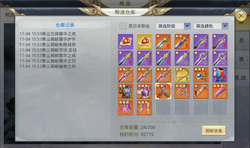 挂机了一天发现背包虽然出了橙装,但是都是重复的怎么办?我们可以好好的利用帮派的捐献装备,把重复的装备捐进仙盟仓库获得贡献点,就能用对应的贡献点换到你需要的装备了,平时多多留意仙盟有什么大家放进去的好东西吧~
