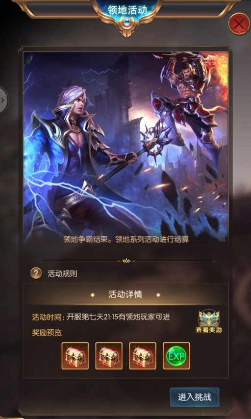 开服第7天晚21:15开启,3个占领领地的联盟成员可进入领地争霸战场,击杀敌对成员和怪物可获得积分,最终分别按照联盟总积分排名和个人积分排名获得稀有圣印奖励和大量经验奖励;